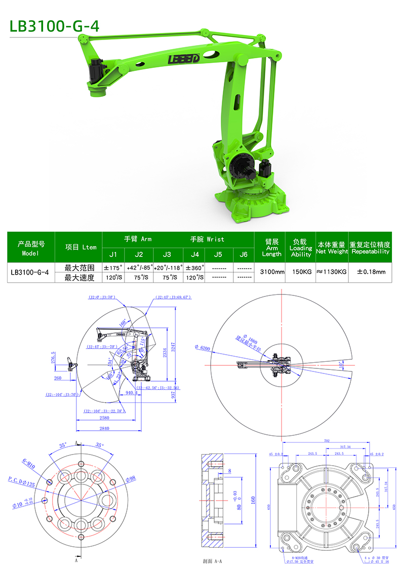 额定负载(kg) | 150 | 活动半径(mm) | 3100 |